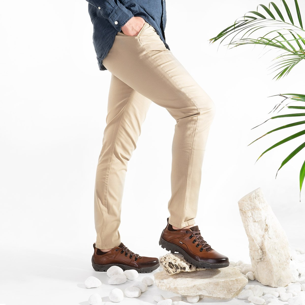 Poszukujesz obuwia męskiego na górskie wyprawy, które zapewni stopom pełen komfort? Wobec tego postaw na trekkingowe buty skórzane Emmet w kolorze brązowym. Ten model warto wziąć pod uwagę także wówczas, jeśli masz w planach zbieranie grzybów czy też innego typu aktywność fizyczną na nierównej powierzchni. A jeśli cenisz oryginalne stylówki miejskie, tym modelem możesz dopełnić również jesienne czy zimowe stylizacje casualowe. Jego ogromny atut stanowi modna barwa, która stworzy zgrany duet z wieloma różnymi kolorami. A to pozwala na uzyskanie mnóstwa modnych zestawień, zarówno spokojnych, jak też zwracających uwagę. Trekkingowe buty Emmet staną się interesującym dopełnieniem kompozycji z udziałem spodni dresowych, sztruksowych, dżinsów czy joggerów. Uzupełnij nimi na przykład koszulę w szaro-brązową kratę i proste dżinsy.