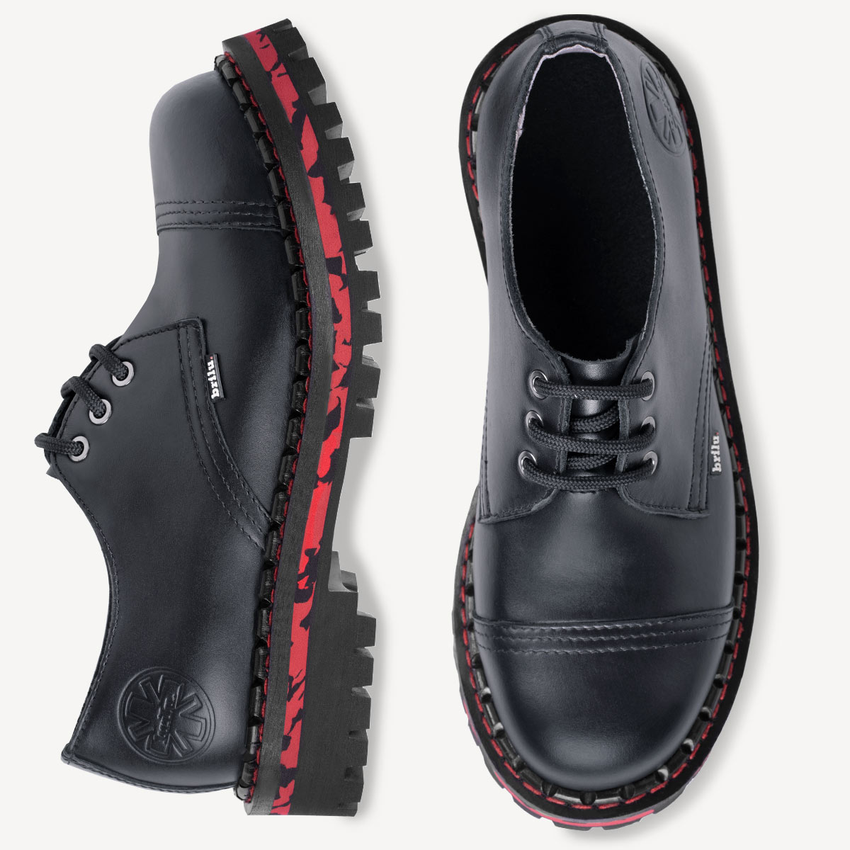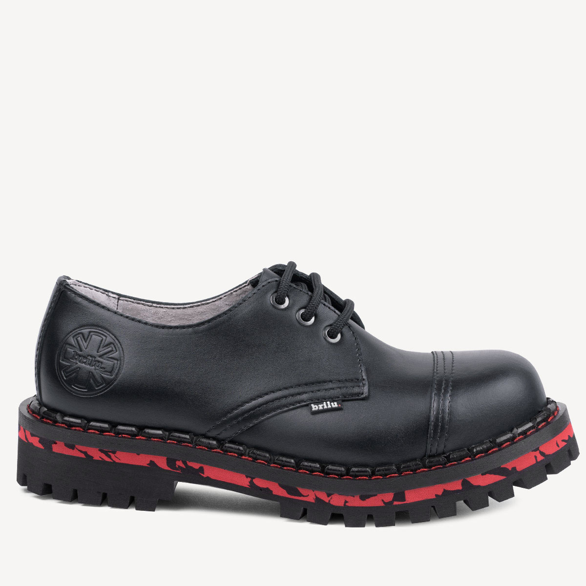 Skórzane glany BRILU niskie 3-dziurki czarne z czerwonymi wstawkami