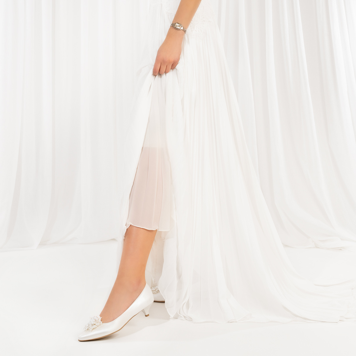 Na ślubne obuwie damskie składają się nie tylko modele z wysokimi obcasami. Doskonale zdajemy sobie sprawę z oczekiwań pań, dlatego w naszej kolekcji pojawiły się też wersje na niskim obcasie, takie jak ślubne perłowe szpilki, z ozdobą z perełek, Kylie w kolorze ivory. Ten model to prosty sposób na w pełni komfortowe towarzyszenie swojemu wybrankowi do miejsca ceremonii zaślubin, jak też na parkiecie. Ślubne perłowe szpilki na niskim obcasie Kylie otrzymały zwracającą uwagę, perełkową ozdobę, dlatego najlepszym towarzystwem dla nich mogą okazać się zwłaszcza skromne, niedopełnione zdobieniami sukienki. Ta śliczna para doda właściwego charakteru na przykład kreacji z dopasowaną górą z dekoltem w szpic i z długim, lekko opadającym dołem. Polecamy je klientkom w każdym wieku.
