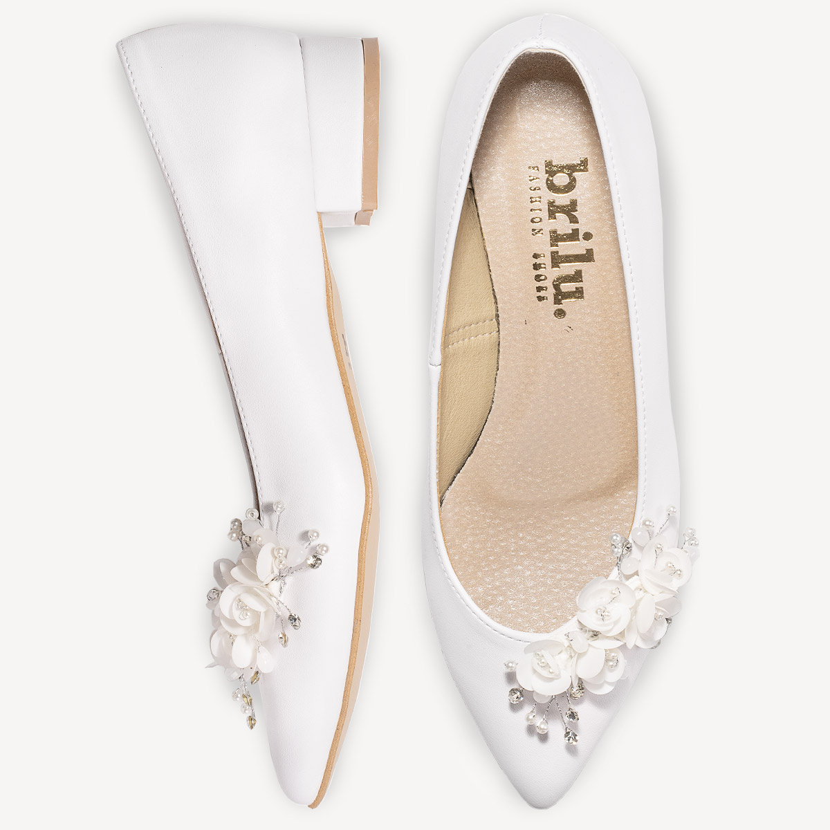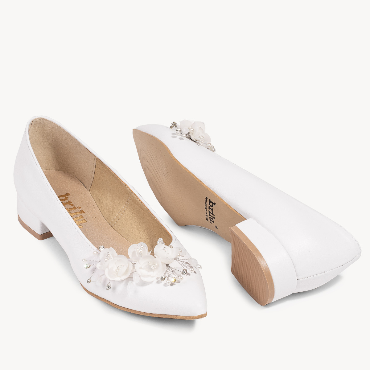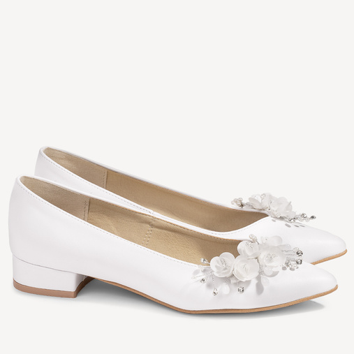 Ślubne licowe balerinki z ozdobą z kwiatami i perełkami Michelle białe