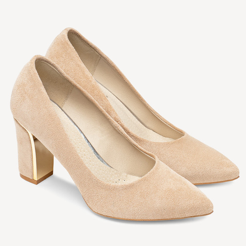Zamszowe czółenka na ozdobnym obcasie Darla w kolorze beżowym - marzenie niejednej kobiety…