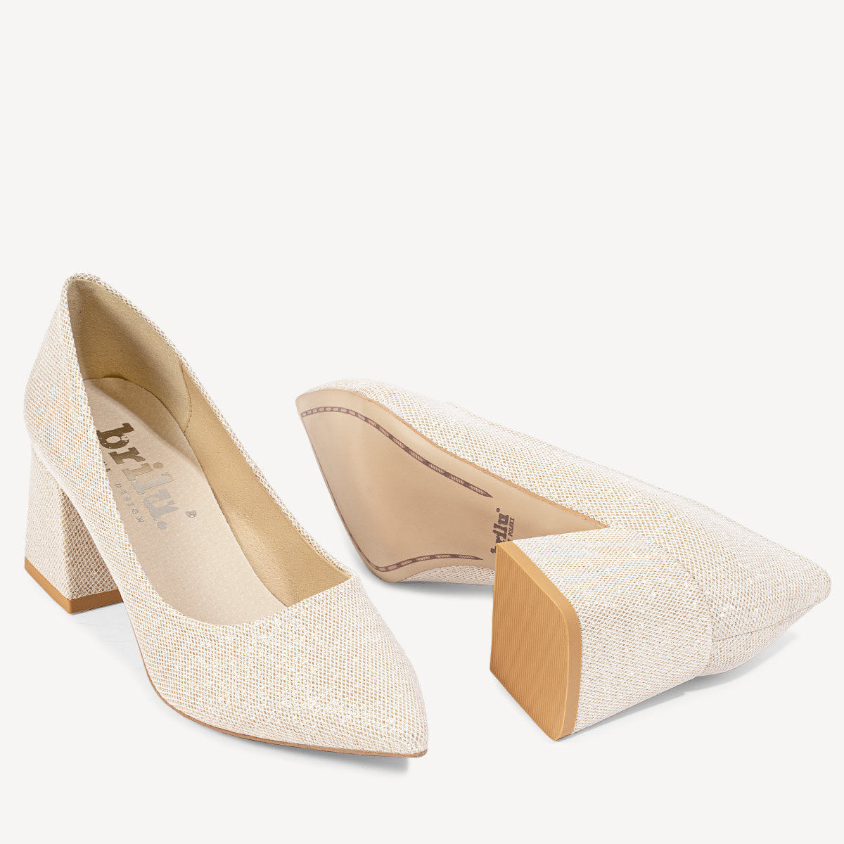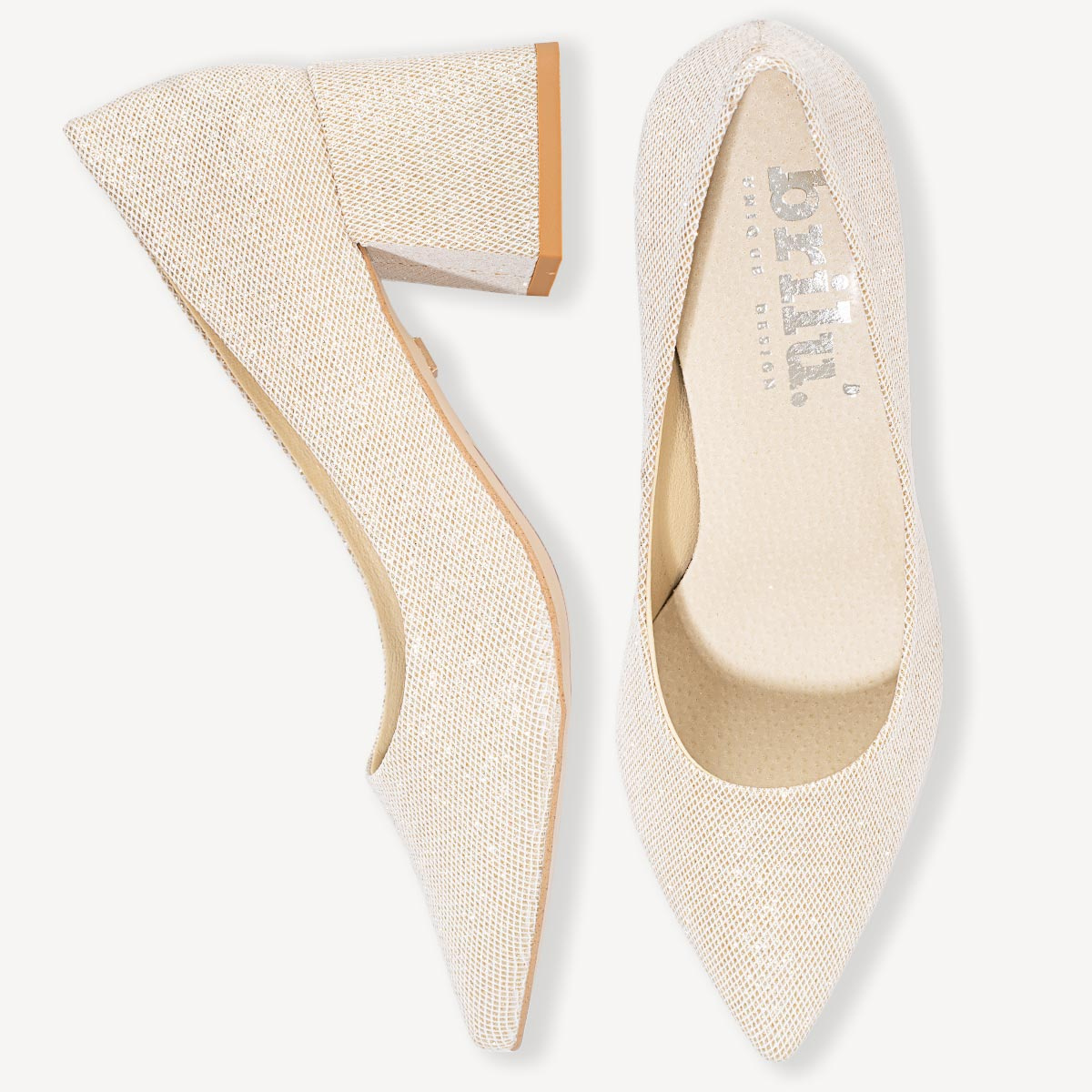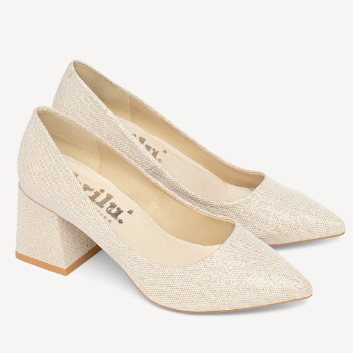 Jeśli kochasz stylizacje nawiązujące do królewskich, koniecznie weź pod uwagę obuwie kobiece utrzymane w królewskiej barwie. W naszej kolekcji znajdziesz między innymi brokatowe ślubne czółenka na słupku Brook w kolorze złotym. Ten model dzięki noskowi w szpic może optycznie wysmuklić i wydłużyć nogi. Polecamy go nie tylko do długich, lecz także do krótszych sukienek, niekoniecznie ślubnych. Brokatowe ślubne czółenka na słupku Brook sprawdzą się również podczas takich wydarzeń jak sylwester, andrzejki, impreza taneczna pod gołym niebem czy też randka. To idealne dopełnienie stylizacji na wyjątkowe okazje i nie tylko.