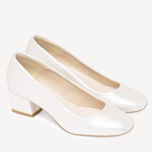 Perłowe ślubne czółenka ze złotą wstawką Courtney w kolorze ivory nawiązują do dawnych modeli, dlatego rewelacyjnie wpisują się w outfity ślubne w stylu retro. Możesz dopełnić nimi na przykład koronkową kreację, z górą na szerokich ramiączkach i lekko rozszerzającym się dołem czy też suknię w stylu minimalistycznym, z długimi, szerokimi rękawami, głębokim dekoltem w szpic i rozkloszowanym dołem. Perłowe ślubne czółenka ze złotą wstawką Courtney mają niewysokie obcasy, dlatego polecamy je między innymi pannom młodym, które mało pewnie czują się w wysokim obuwiu. Ten szykowny model może świetnie prezentować się też podczas innego rodzaju wydarzeń.