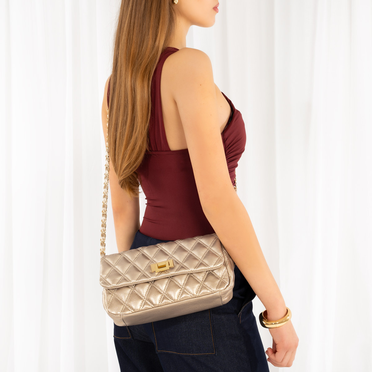 Kopertówka Leya przyciąga wzrok swoim eleganckim pikowanym wzorem, który dodaje jej niepowtarzalnego uroku i szyku. Złoty kolor torebki wprowadza element luksusu i doskonale komponuje się z różnorodnymi stylizacjami – od klasycznych, białych sukni ślubnych po bardziej odważne, kolorowe kreacje wieczorowe.