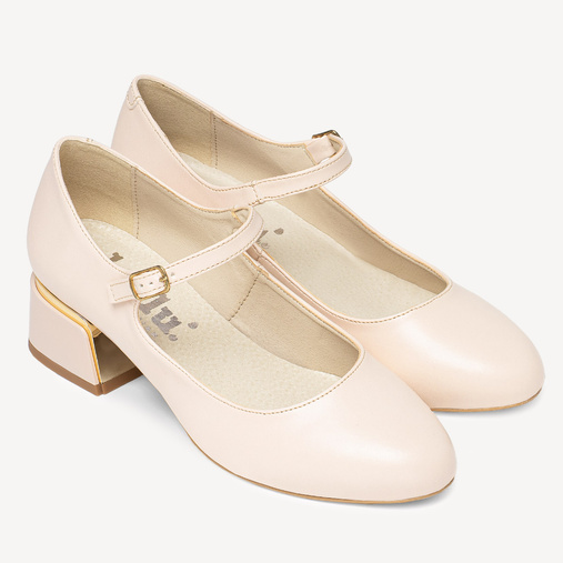 Miya to czółenka, które oczarowują subtelnym designem, a jednocześnie zapewniają najwyższy poziom wygody. To buty wykonane ze skóry ekologicznej. Ich wnętrze wykończone jest z kolei skórą naturalną, dzięki czemu dopasowują się do kształtów stopy i nie powodują dyskomfortu. Zastosowane wyprofilowane wkładki Doubly Comfy są ultramiękkie, oddychające, a do tego doskonale trzymają stopę i zapobiegają przesuwaniu się jej podczas chodzenia. Czółenka mają okrągły nosek i obcas typu klocek o wysokości 4,5 cm, na którym zastosowano piękną, złotą ozdobę. Na środku cholewki umieszczono dodatkowo paseczek regulowany za pomocą złotej sprzączki, który pozwala jeszcze lepiej dopasować buty do stóp.