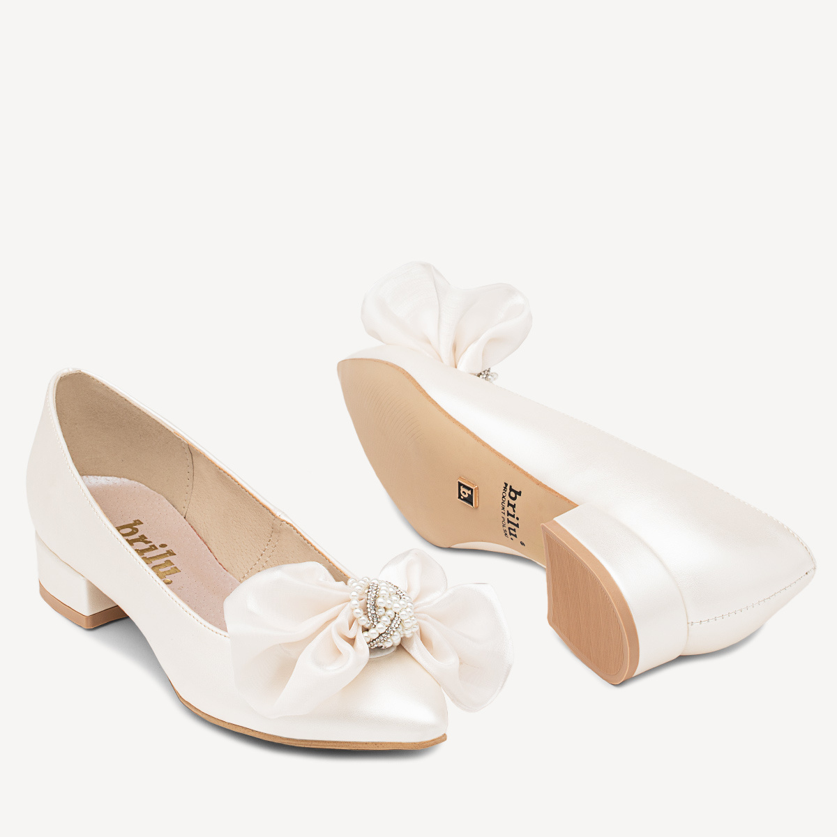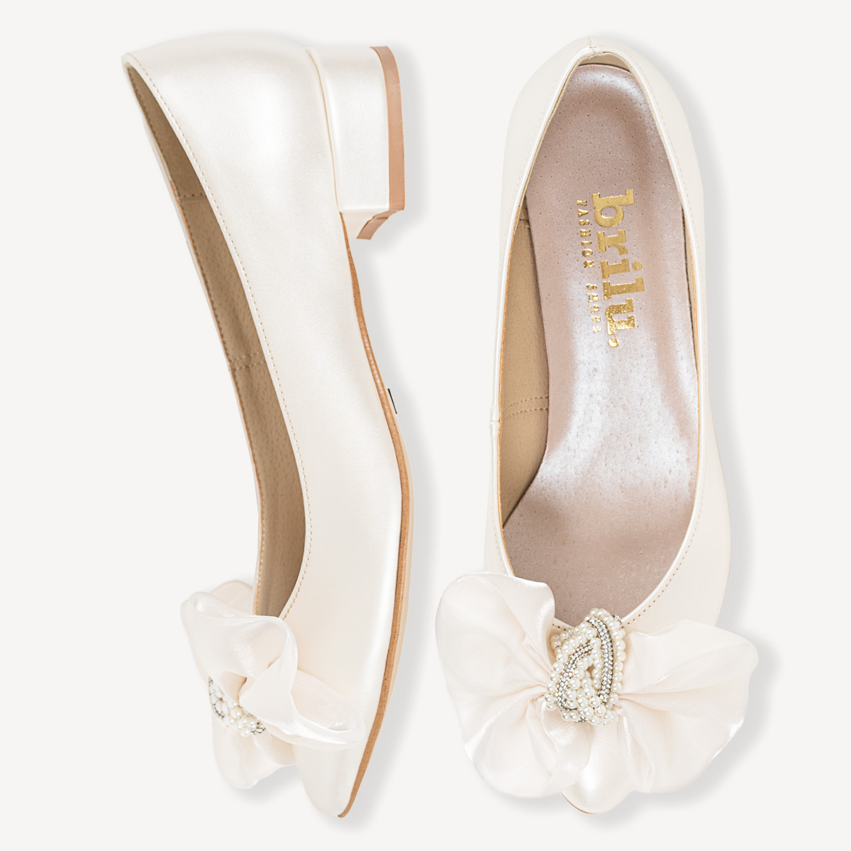 Alicia – ślubne perłowe czółenka balerinki z ozdobną kokardą