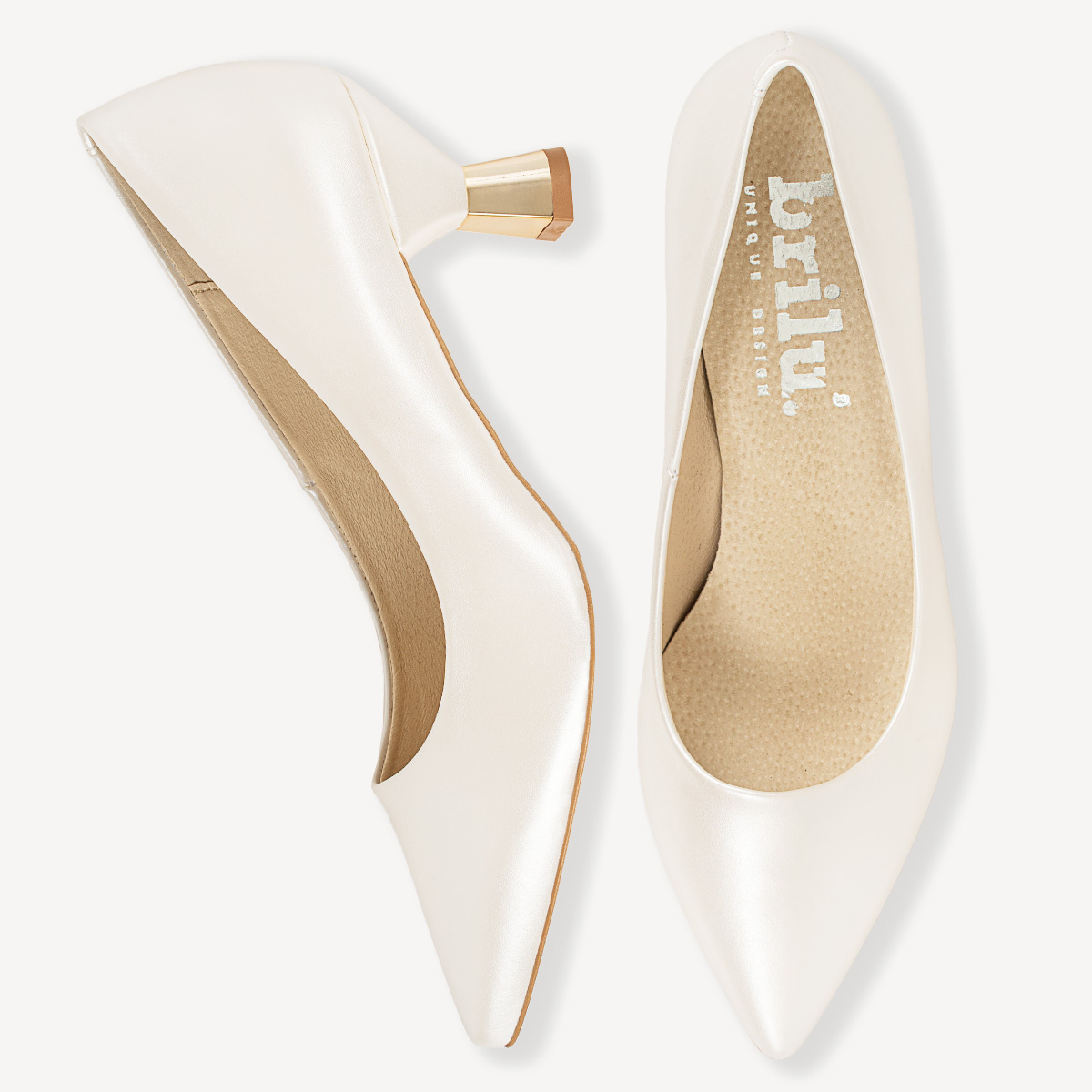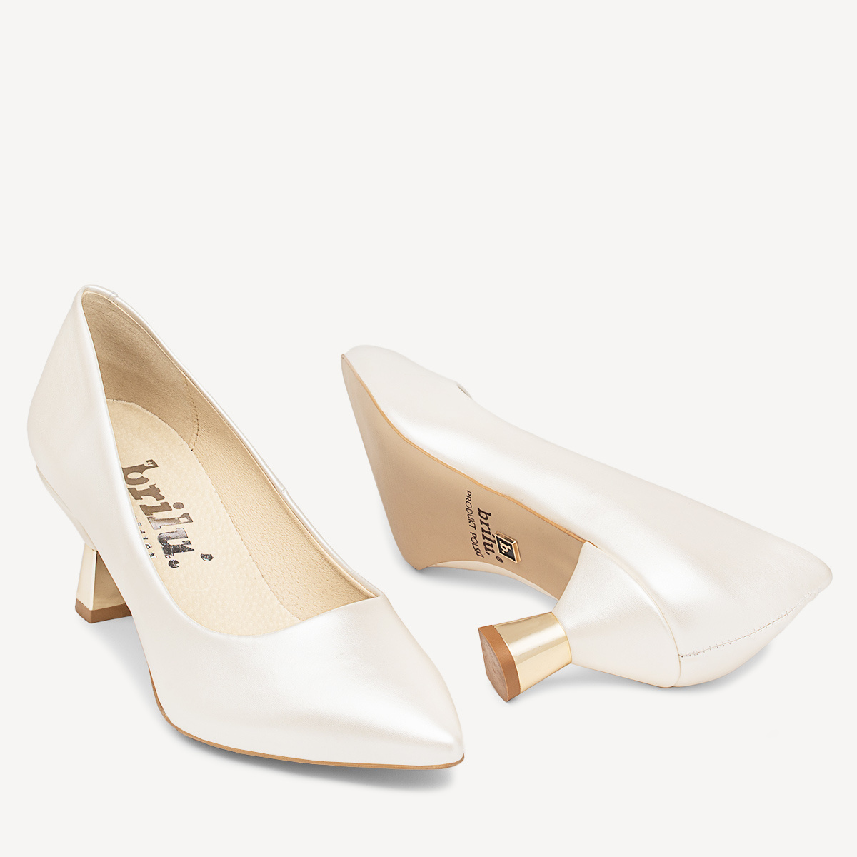 Ślubne szpilki Brienne w odcieniu ivory to idealny wybór dla Panien Młodych, które cenią klasykę w luksusowym wydaniu. Perłowe wykończenie nadaje butom delikatny blask, a ozdobny obcas w biżuteryjnym stylu przyciąga spojrzenia i podkreśla wyjątkowość stylizacji. To szpilki, które perfekcyjnie uzupełnią zarówno klasyczne, jak i nowoczesne kreacje ślubne.