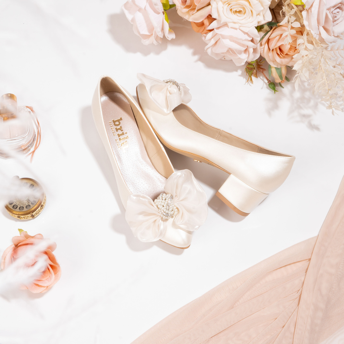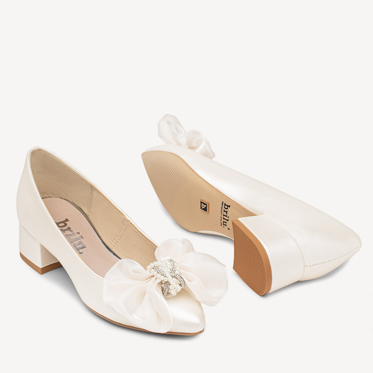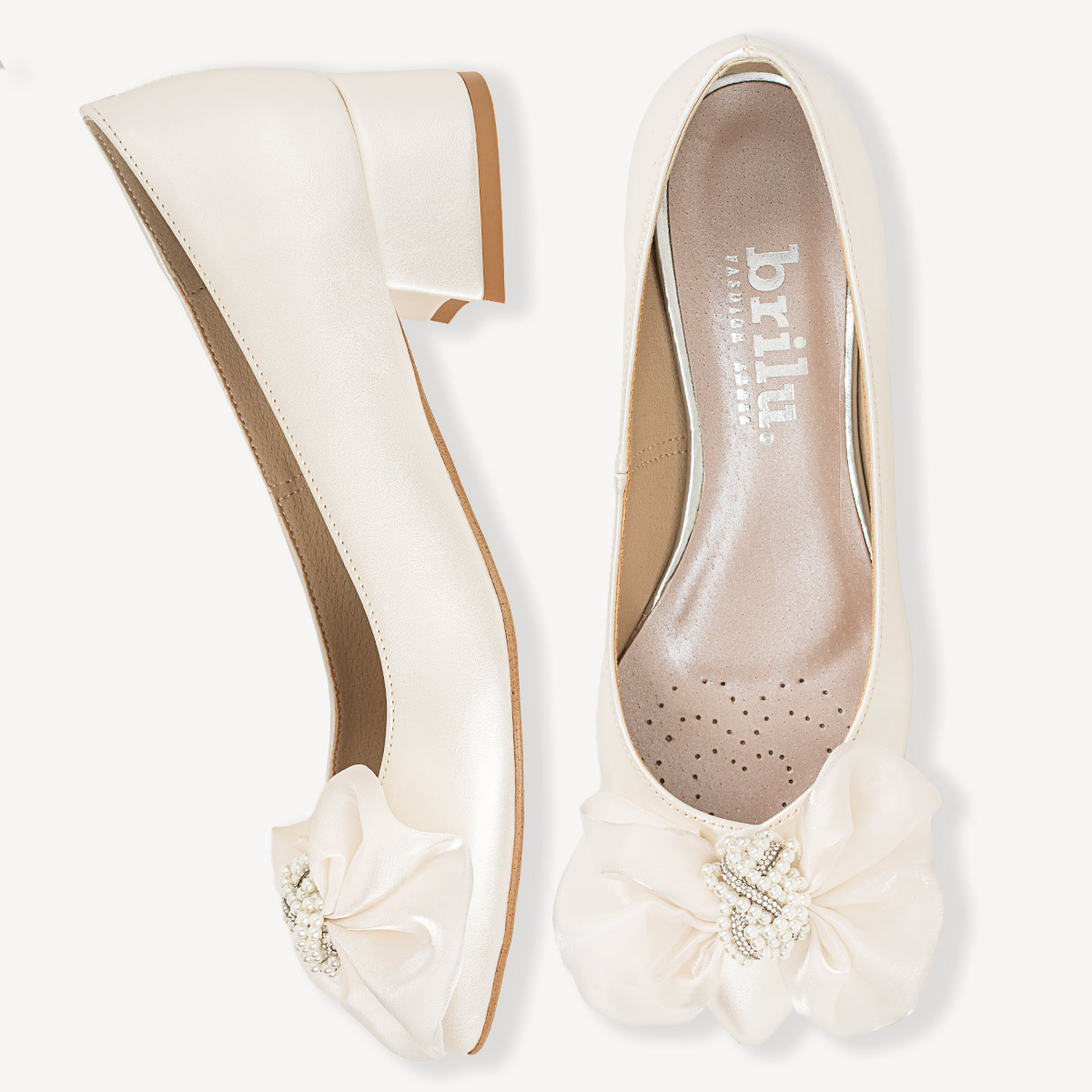 Ślubne czółenka na niskim obcasie z ozdobną kokardą Ariadna ivory