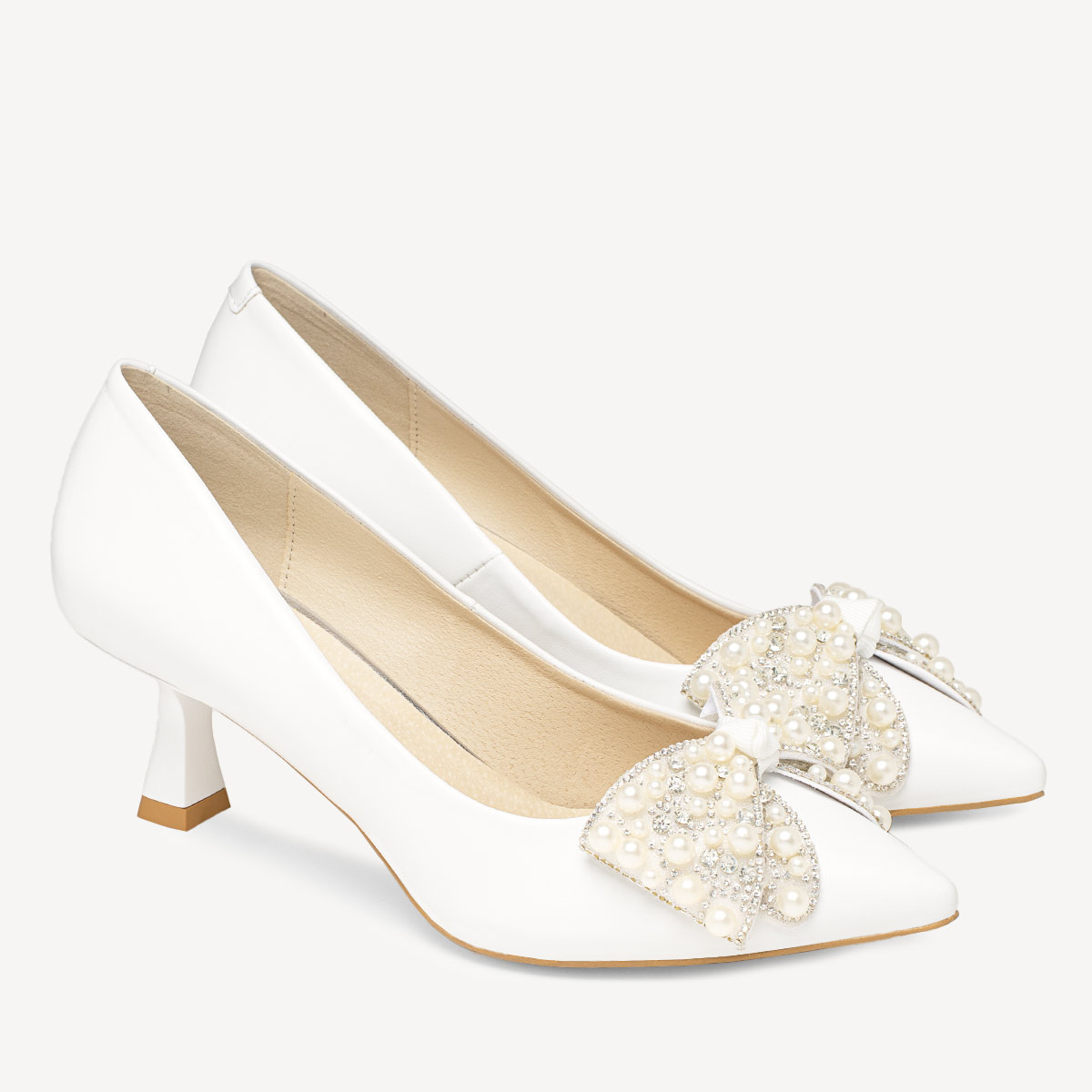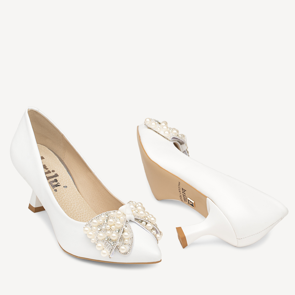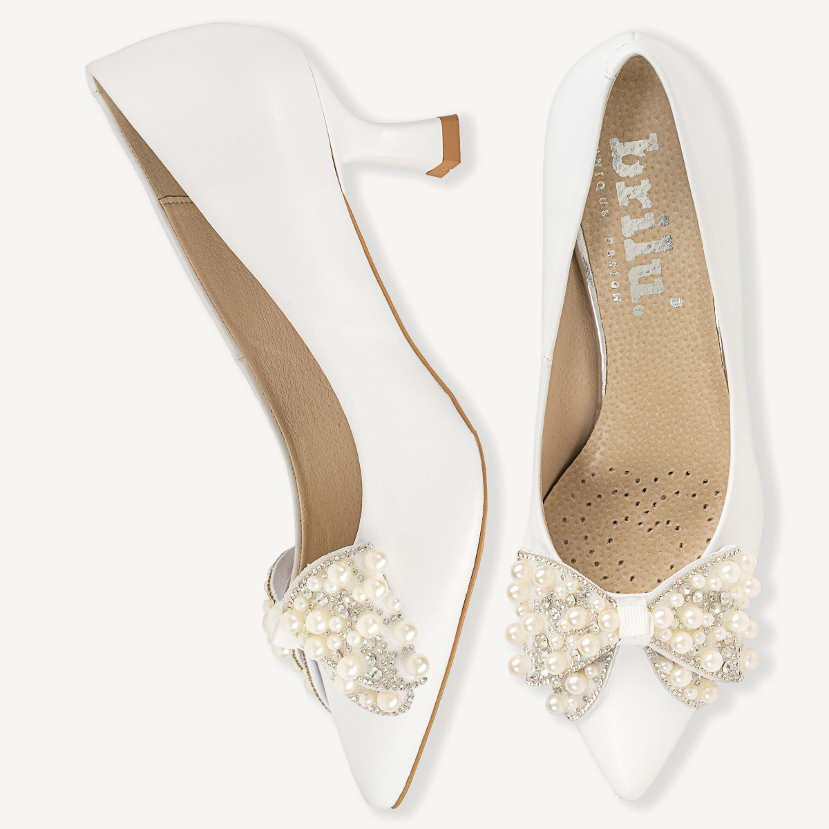 Ślubne klasyczne szpilki z ozdobną kokardą Aryane białe