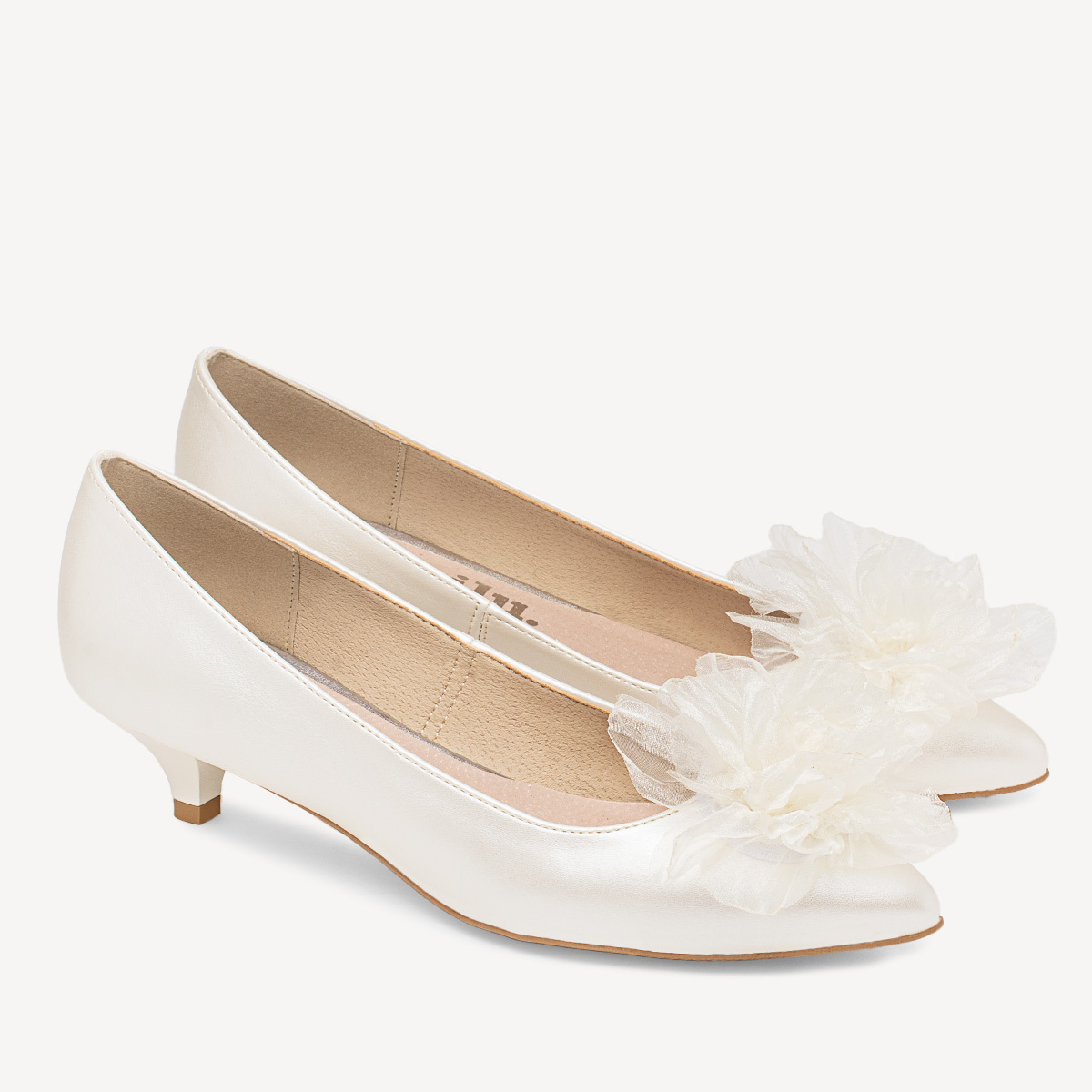 Ślubne perłowe niskie szpilki z kwiatową ozdobą Lyria ivory