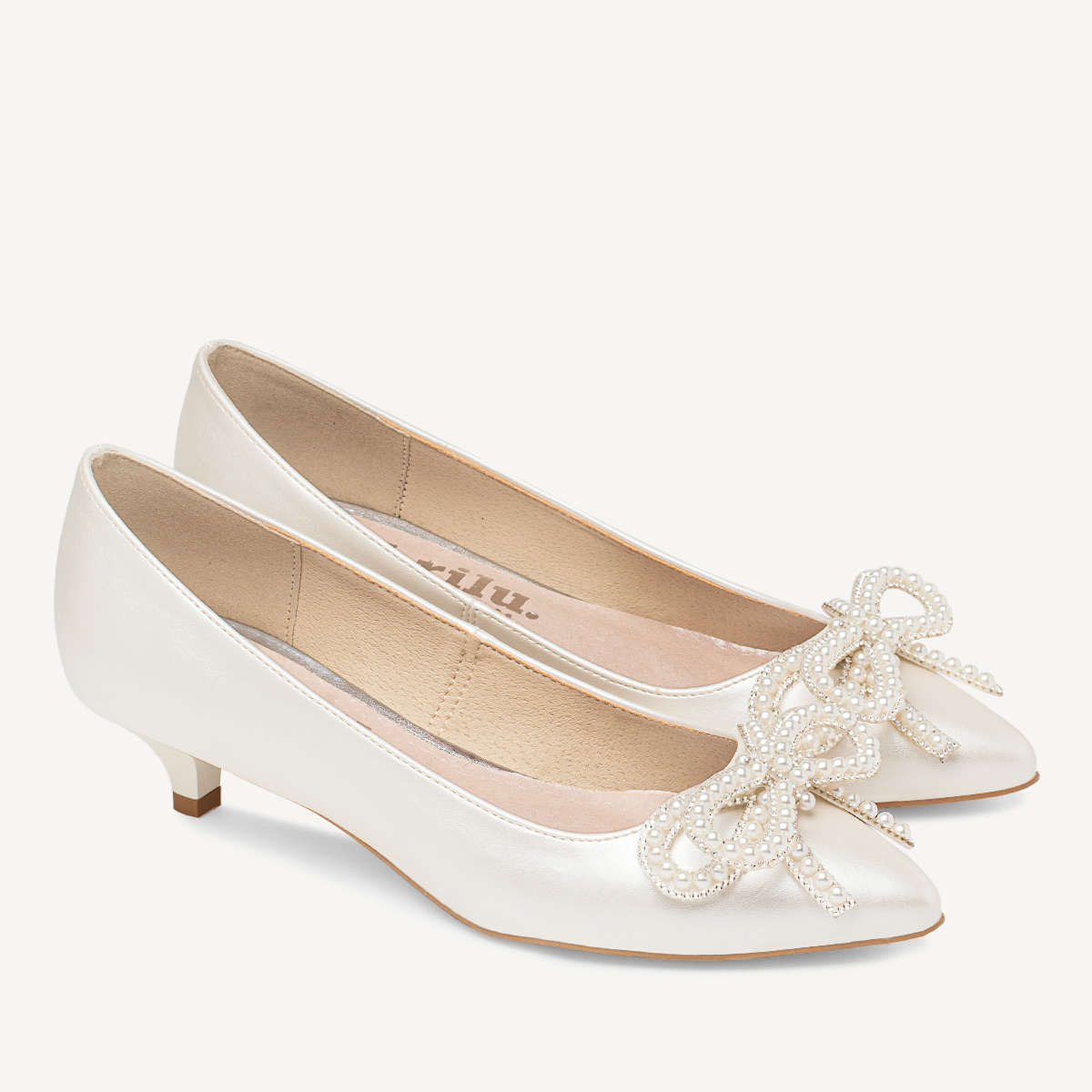 Ślubne perłowe niskie szpilki z ozdobną kokardą Polina ivory