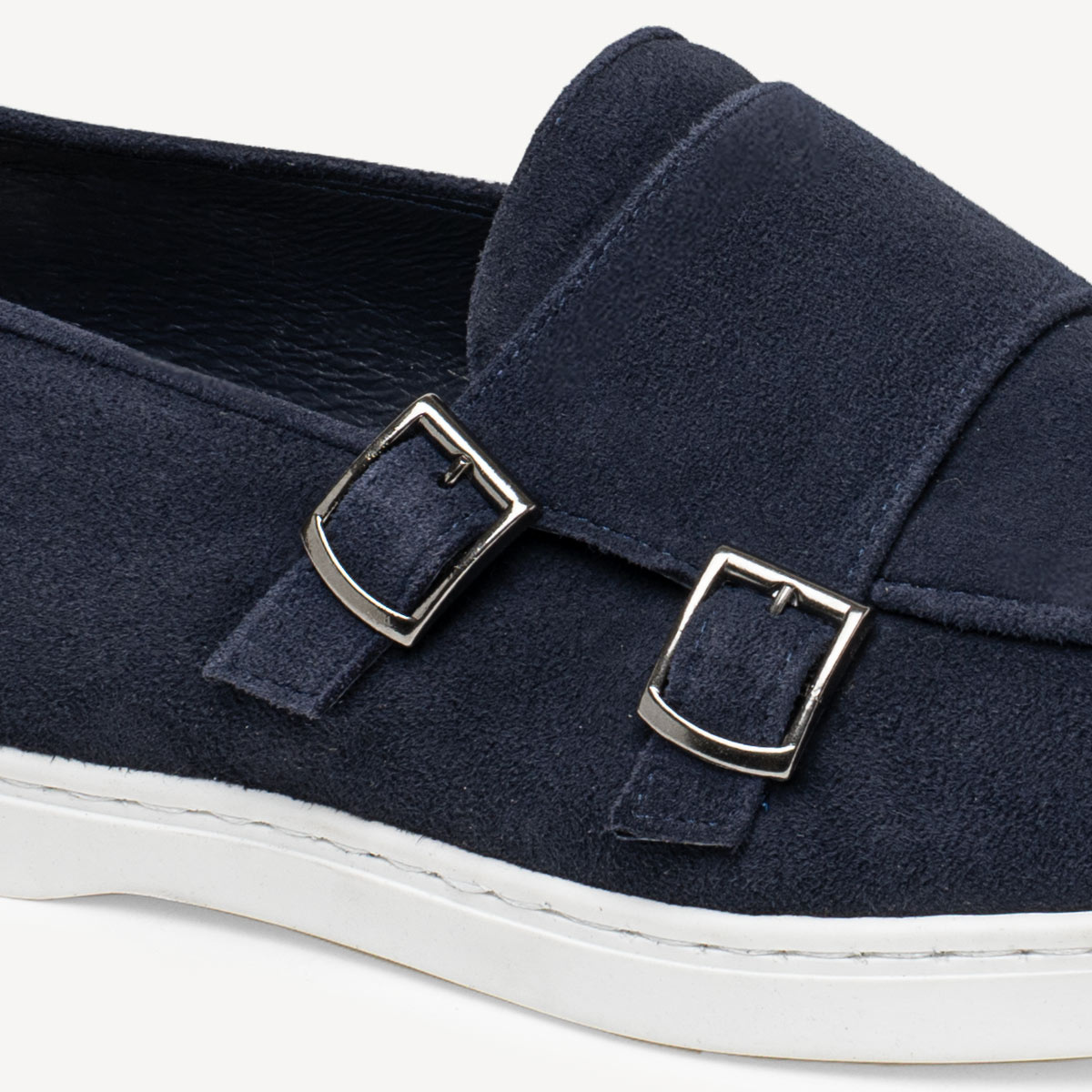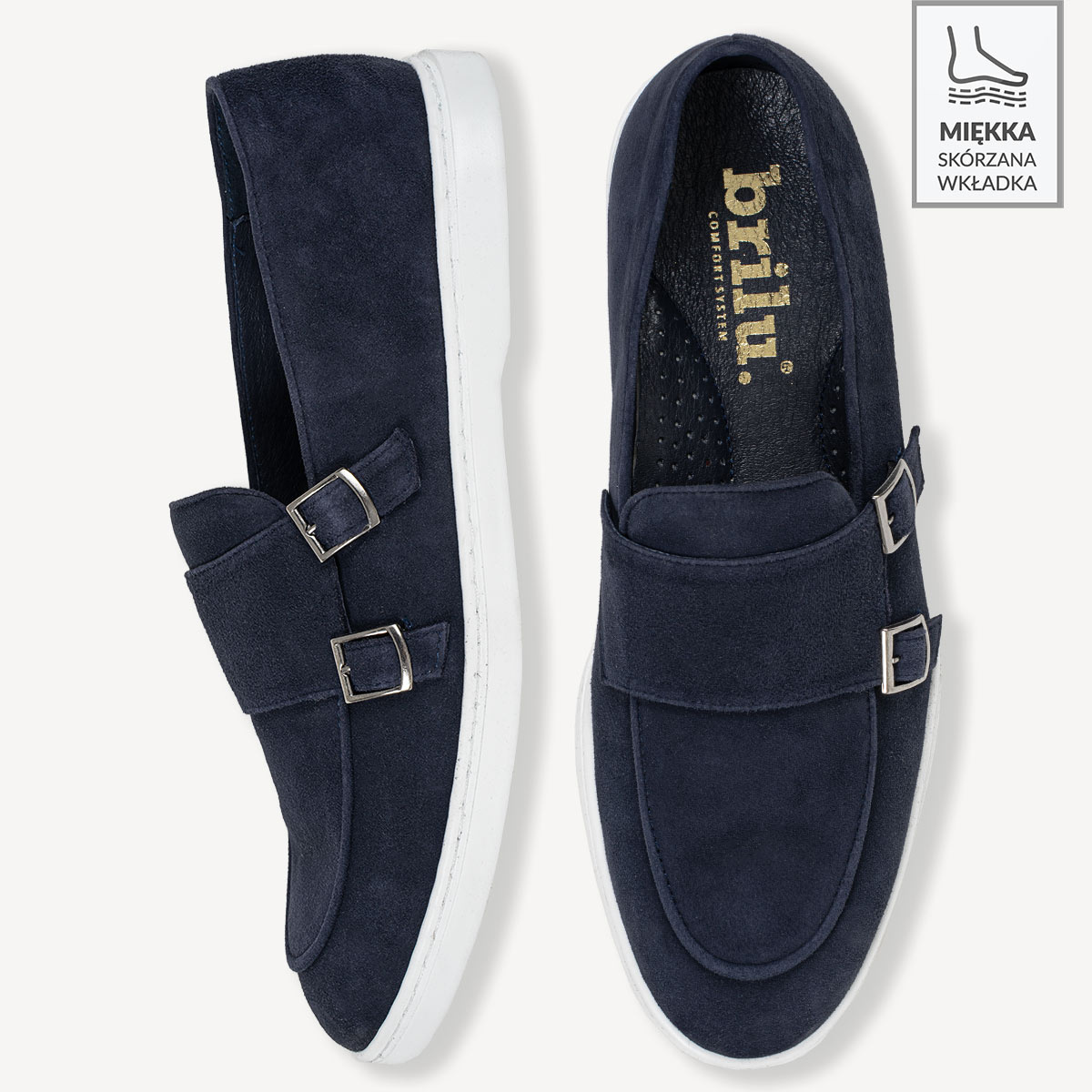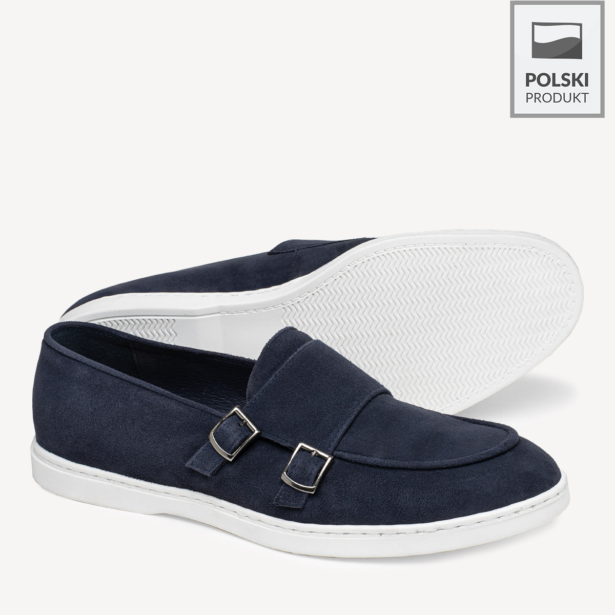 Loafersy męskie z klamerkami Logan zostały wykonane w Polsce z najwyższej jakości skóry naturalnej (zamsz kozi) w głębokim odcieniu granatu. Zachwycają starannością wykończenia, oryginalnym designem oraz maksymalną wygodą noszenia. Granatowe skórzane wnętrze oraz granatowa skórzana wkładka Comfort System idealnie dopasowuje się do kształtu stopy, eliminując uczucie dyskomfortu, nawet podczas intensywnego dnia na nogach.