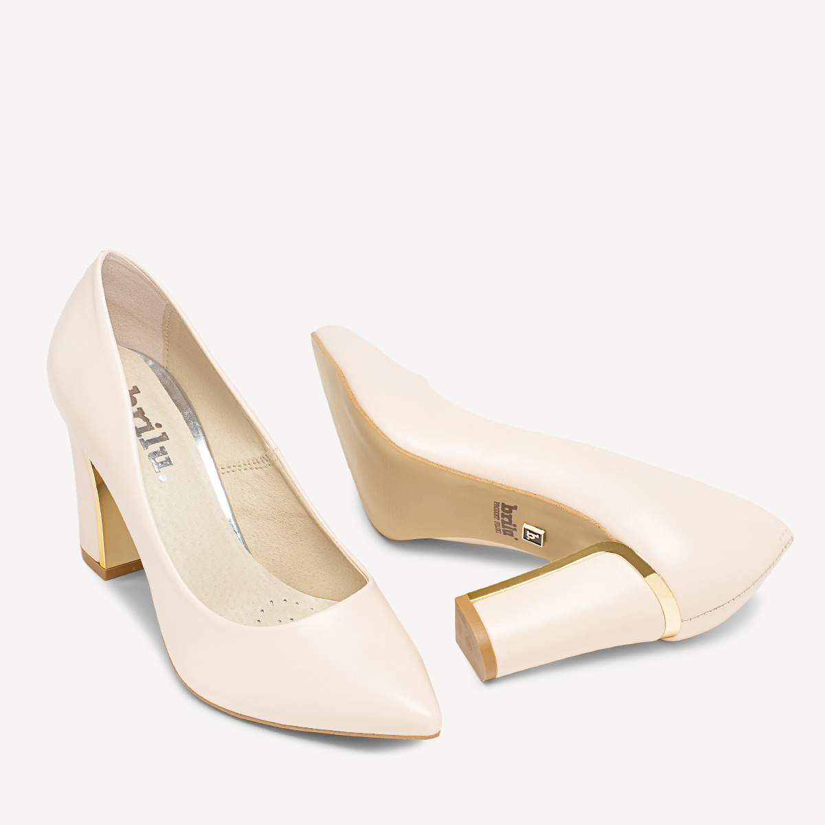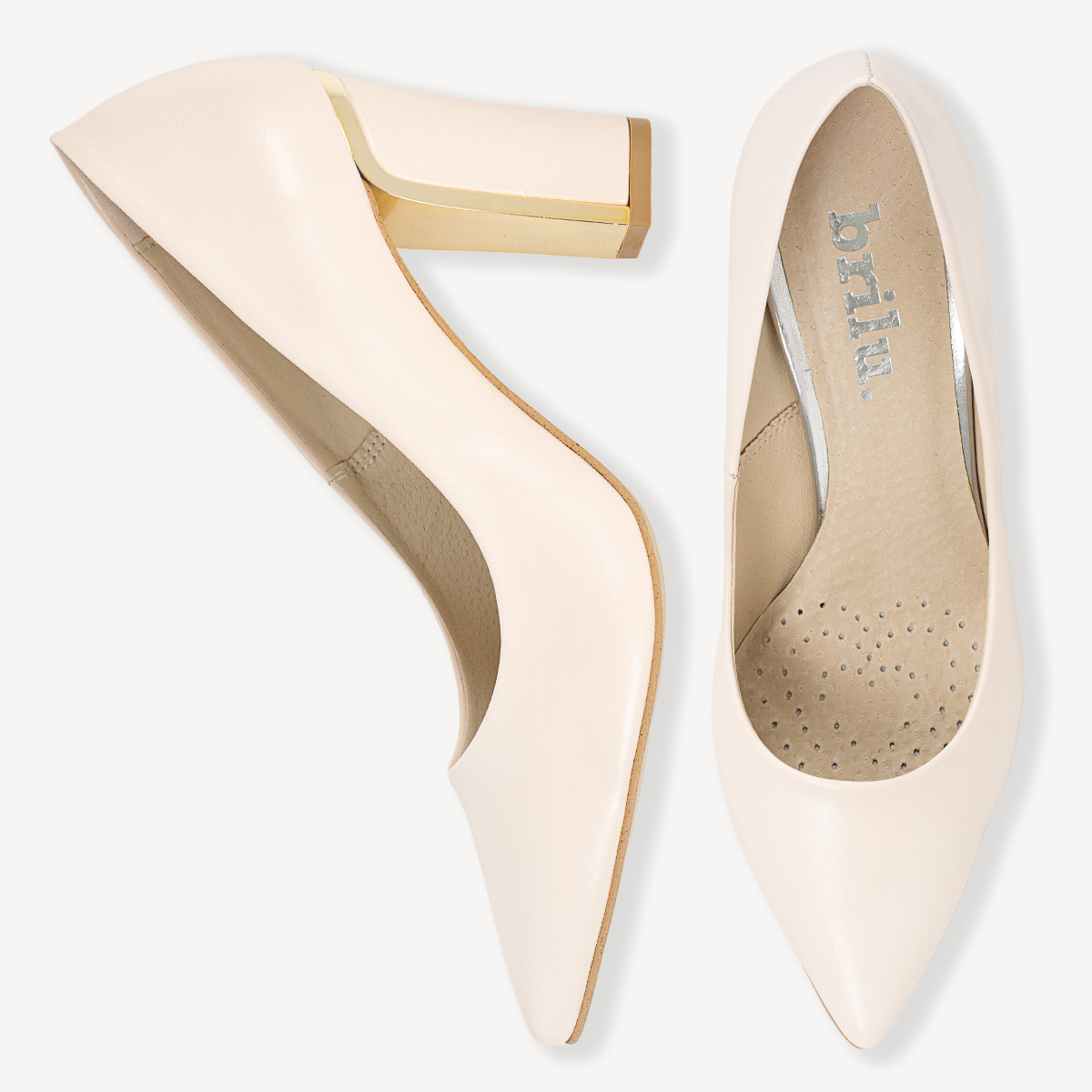 Szukasz idealnego obuwia na swój ślub? Postaw na czółenka ślubne Vivienne! To wyjątkowe buty damskie, które łączą w sobie wysokiej jakości materiały z subtelnie wyprofilowaną linią buta oraz obcasem w formie słupka wzbogaconym o złotą, ozdobną wstawkę. Model Vivienne od polskiej marki Brilu będzie doskonałym wyborem nie tylko na Twój wielki dzień, ale i na inne specjalne okazje. Cieliste czółenka Vivienne z powodzeniem będziesz mogła założyć jako czółenka na wesele, buty na sesję zdjęciową lub na inne wyjątkowe okazje.