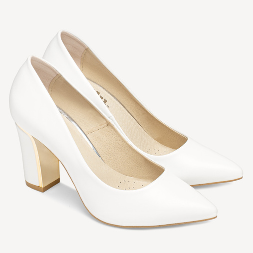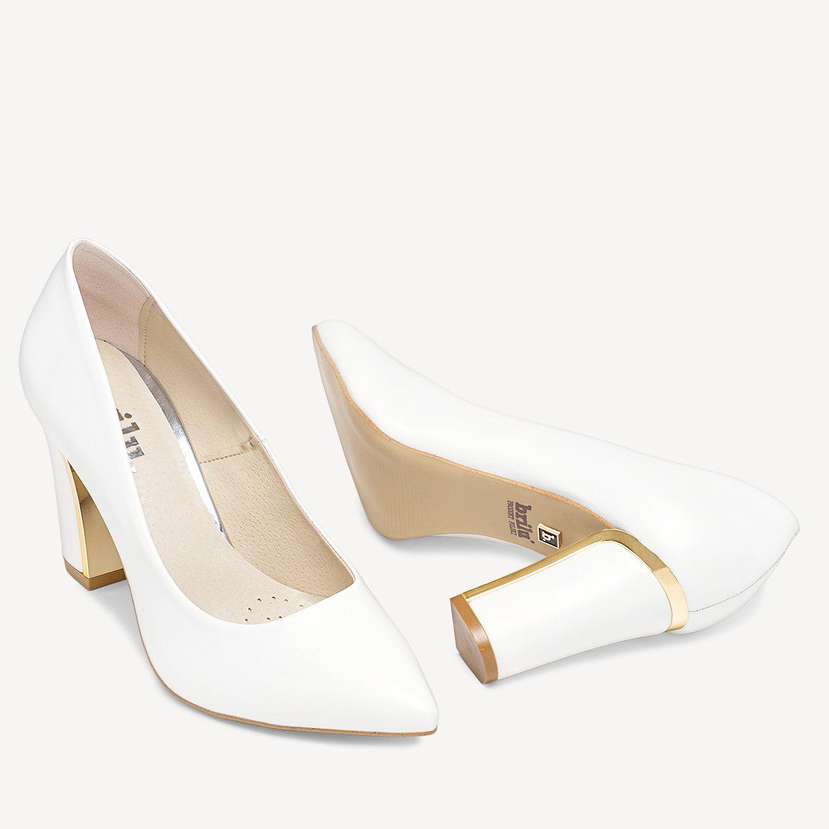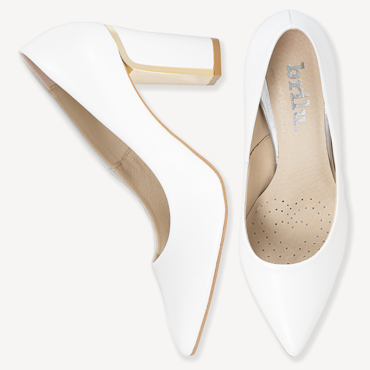 Szukasz idealnego obuwia na swój ślub? Postaw na czółenka ślubne Vivienne! To wyjątkowe buty damskie, które łączą w sobie wysokiej jakości materiały z subtelnie wyprofilowaną linią buta oraz obcasem w formie słupka wzbogaconym o złotą, ozdobną wstawkę. Model Vivienne od polskiej marki Brilu będzie doskonałym wyborem nie tylko na Twój wielki dzień, ale i na inne specjalne okazje. Białe czółenka Vivienne z powodzeniem będziesz mogła założyć jako czółenka na wesele, buty na sesję zdjęciową lub na inne wyjątkowe okazje.