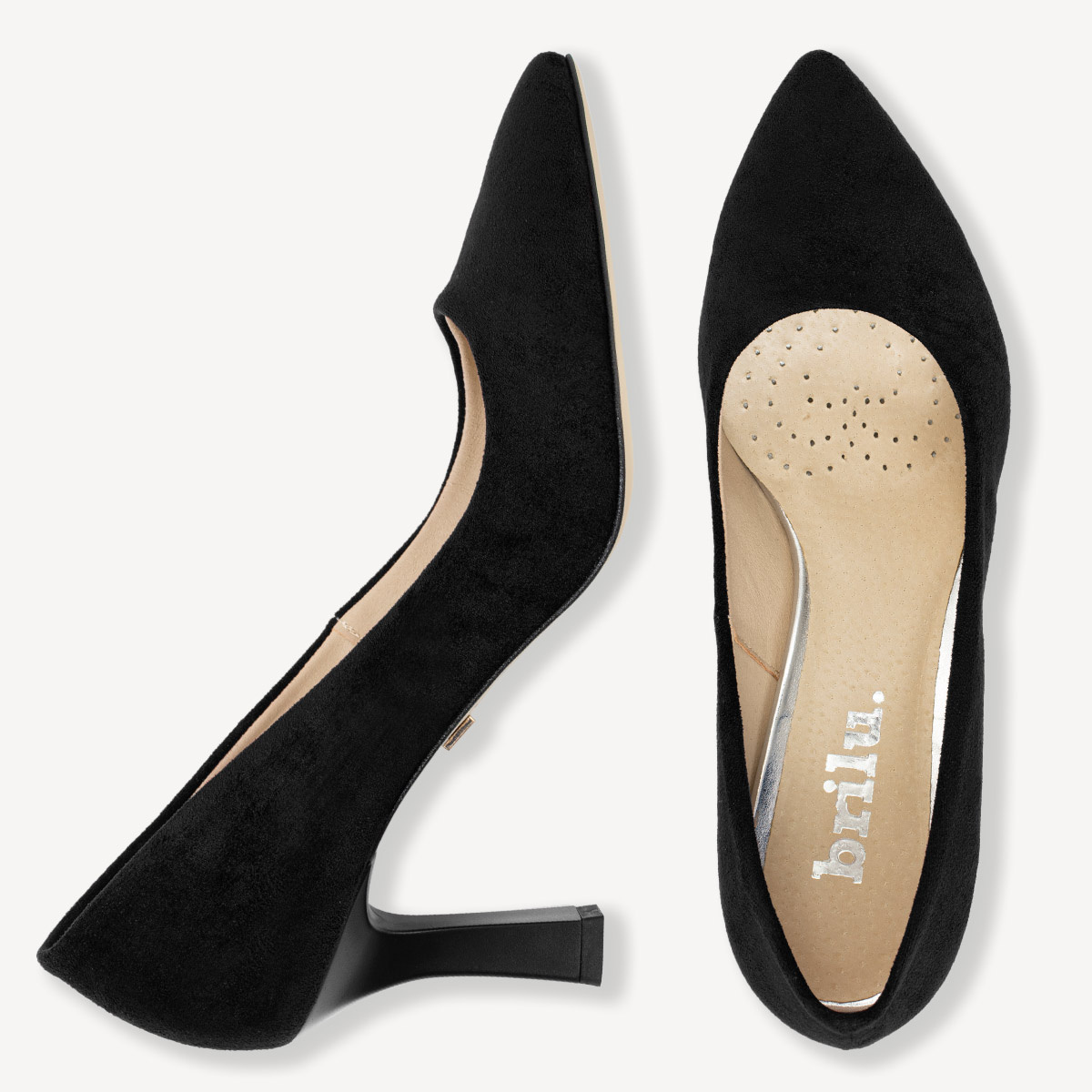 Czarne klasyczne szpilki Damaris wykonano z wysokogatunkowej zamszowej skóry syntetycznej i osadzono na 7,5 cm obcasie, który pięknie podkreśla sylwetkę i dodaje jej lekkości. Szpiczasty nosek optycznie wydłuża nogi, a miękka, skórzana wkładka dopasowuje się do kształtu stopy, zapewniając komfort przez całą uroczystość. Ich klasyczny fason doskonale sprawdzi się jako dodatek do eleganckich stylizacji na wieczór - model Damaris będzie odpowiednim wyborem zarówno jako szpilki na wesele, szpilki na studniówkę, jak i na inne wyjątkowe okazje.
