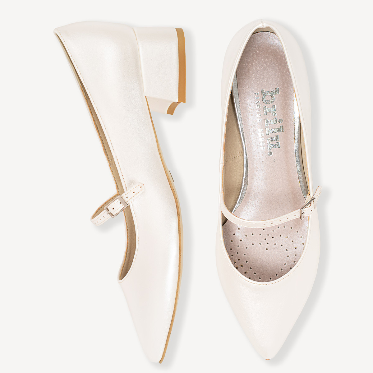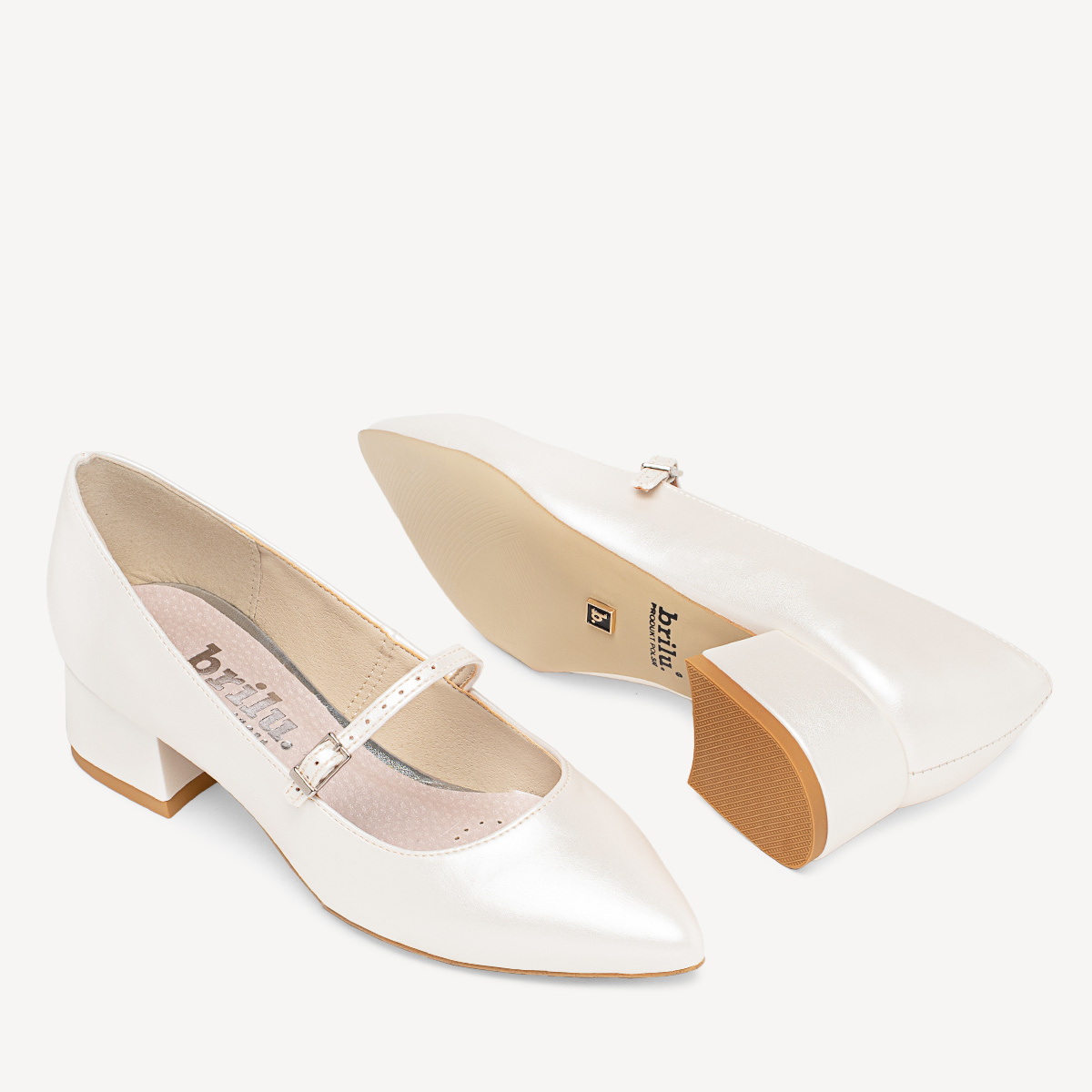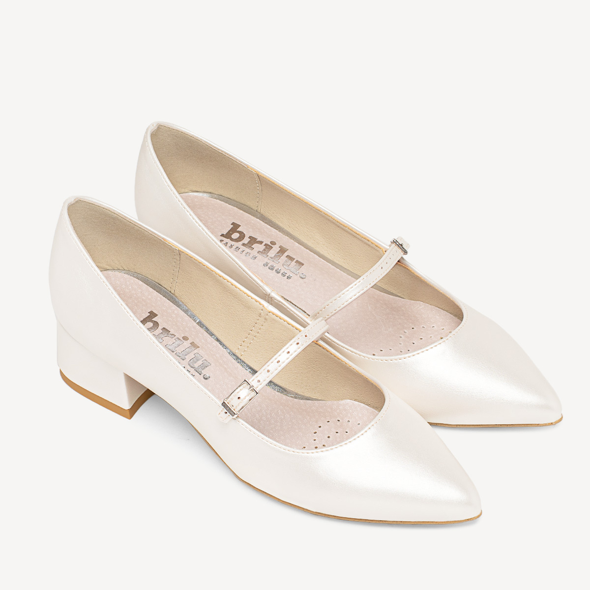 Ślubne perłowe czółenka na niskim obcasie z paskiem Klara ivory