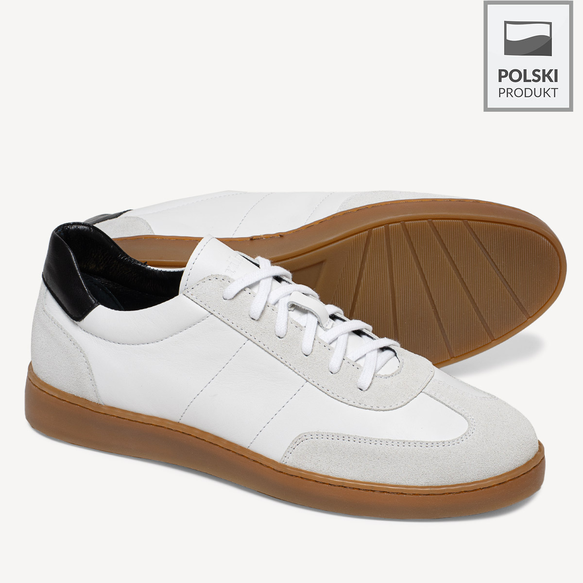 Białe sneakersy męskie Callen zostały wykonane w Polsce z wysokiej jakości skóry naturalnej - oferują trwałość i pełen komfort na co dzień. Wyróżniają się kontrastowymi elementami kolorystycznymi oraz zamszowymi akcentami, które nadają im wyrazistego charakteru. Precyzyjnie dobrane materiały i uzupełniające się faktury: zamsz, skóra licowa oraz detale w modnych kolorach sprawiają, że skórzane białe sneakersy Callen idealnie wpisują się w aktualne trendy.