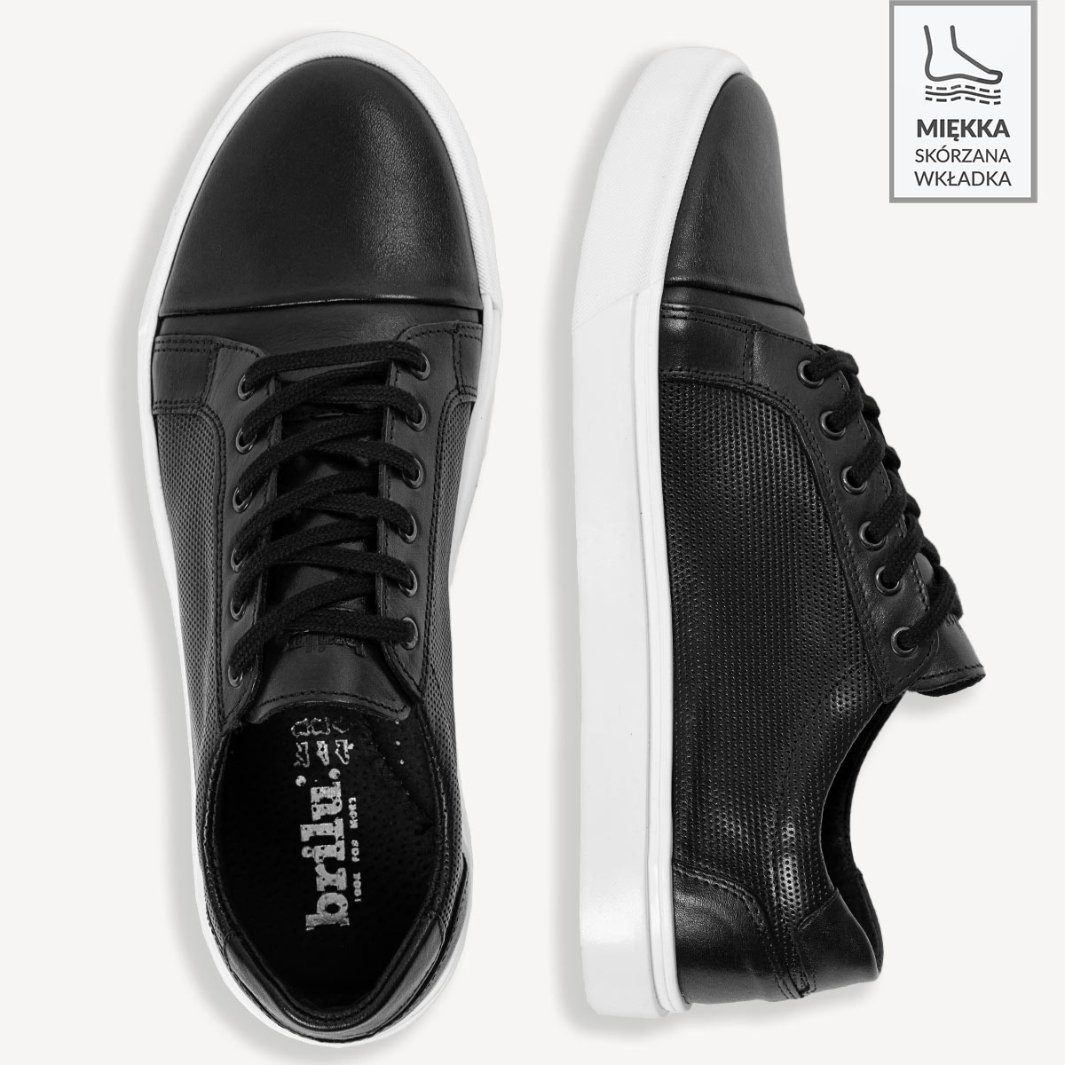 Czarne trampki skórzane Phill to obuwie dla mężczyzn, którzy cenią sobie wygodę oraz solidne wykonanie. Powstały w Polsce ze skóry naturalnej, dzięki czemu są odporne na codzienne użytkowanie i posłużą przez długi czas. Skórzana wyściółka i wkładka zadbają o Twój komfort nawet podczas wielu godzin aktywności, dlatego czarne sneakersy Phill świetnie sprawdzą się jako skórzane buty na co dzień.