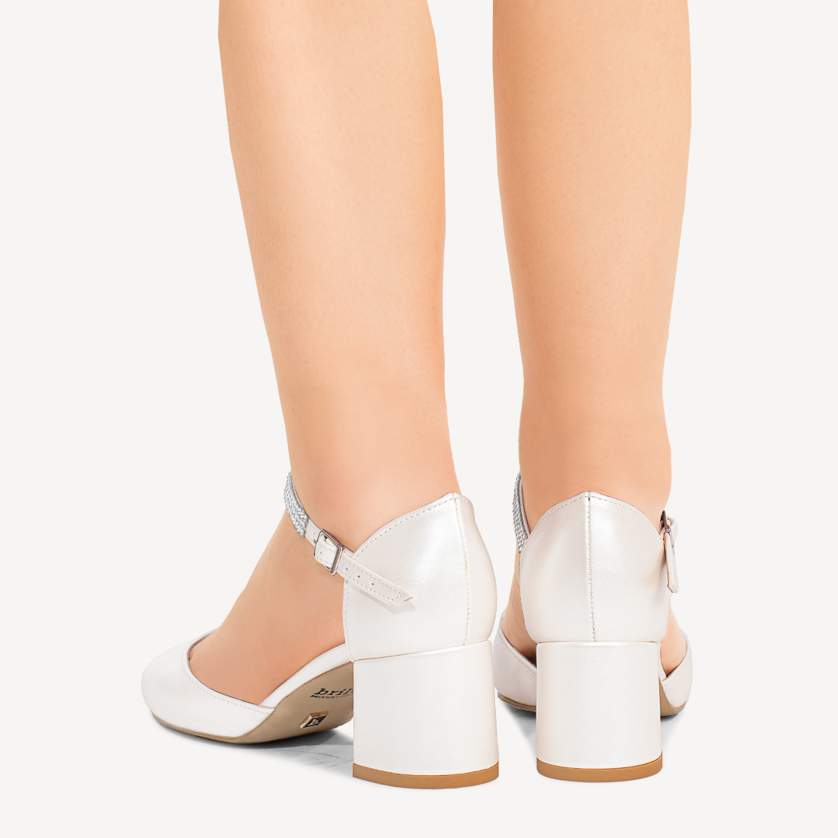 Czółenka ślubne Linda to zjawiskowa elegancja w nowej odsłonie! Zostały stworzone z myślą o pełnym komforcie - miękka, skórzana wkładka oraz niski słupek o wysokości 5,5 cm zapewnia pewność kroku i stabilność przez cały dzień. Ich wyjątkowy charakter podkreśla połyskujący pasek ozdobiony cyrkoniami, który przyciąga spojrzenia i dodaje kreacji luksusowego akcentu. Czółenka z cyrkoniami Linda będą perfekcyjnym wyborem jako buty do ślubu!