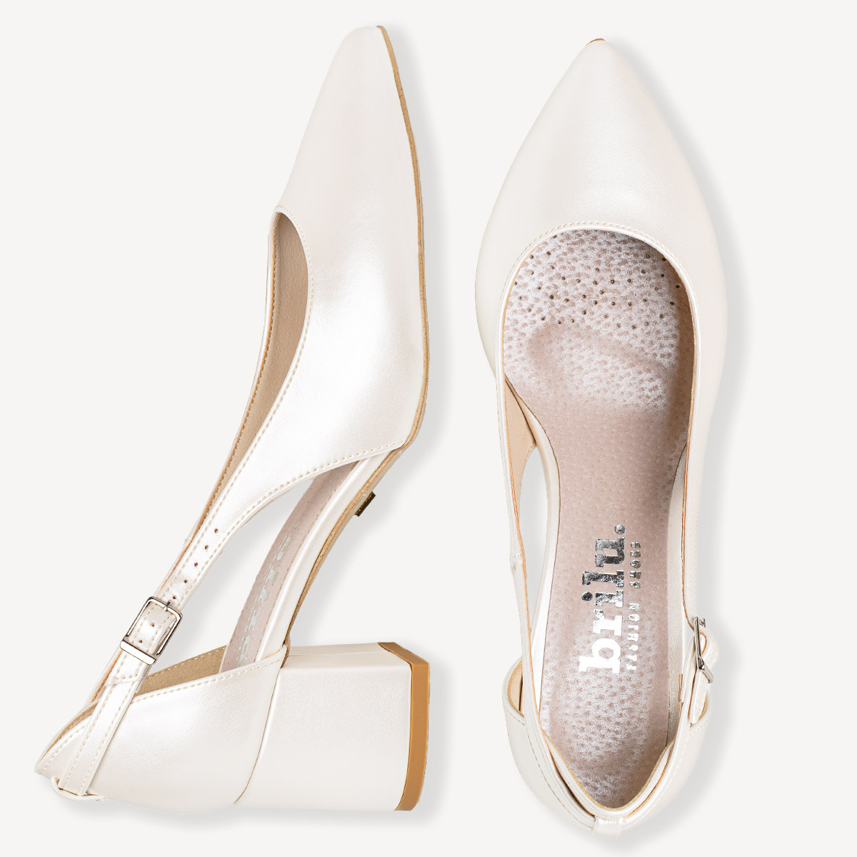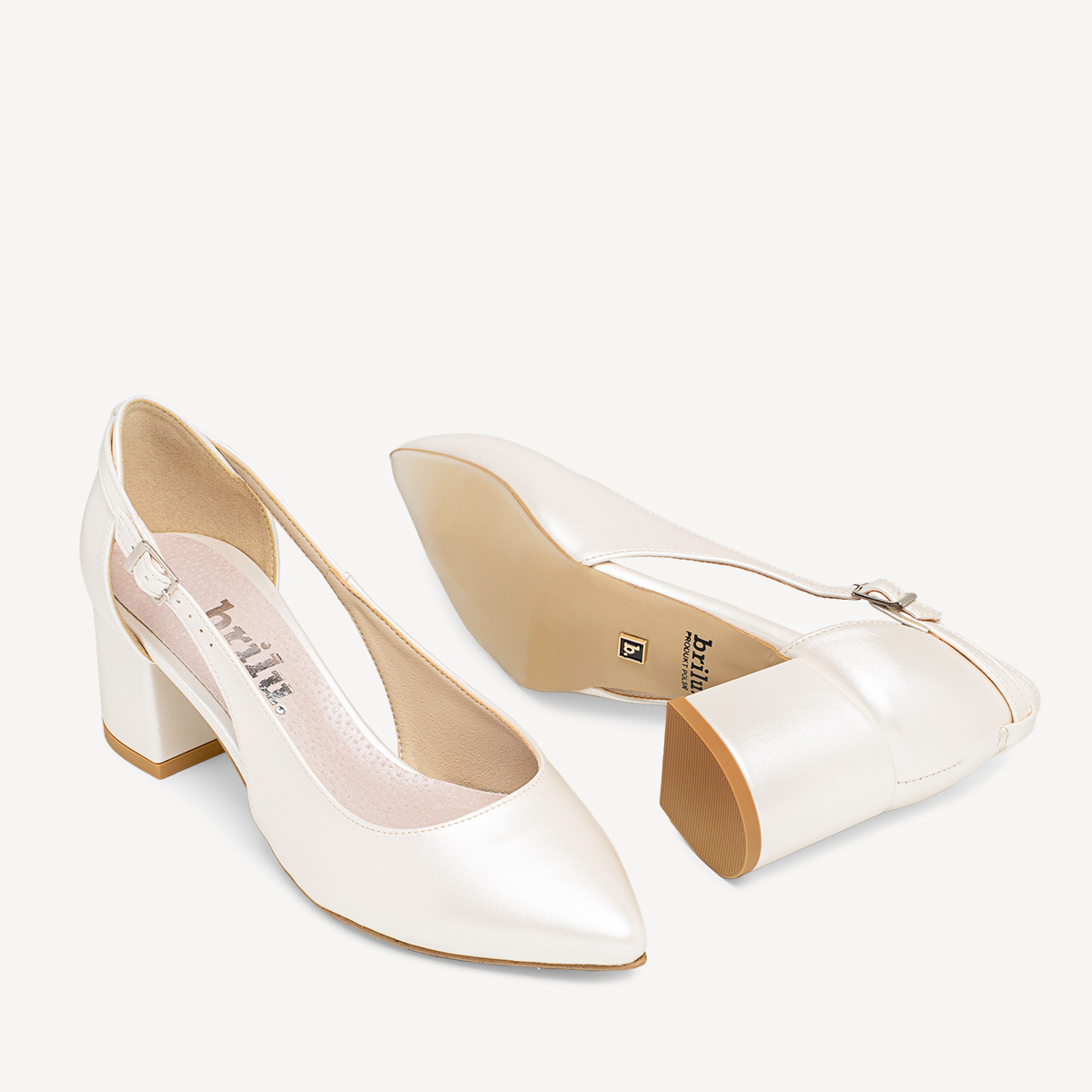 Czółenka ślubne Noemie łączą w sobie nowoczesny design z wyjątkowym komfortem noszenia. Ich smukła sylwetka i delikatnie wyprofilowany nosek sprawiają, że wyglądają niezwykle elegancko, jednocześnie zapewniając stabilność podczas chodzenia. Wnętrze buta wyposażono w miękką, skórzaną wkładkę, która zadba o wygodę przez cały dzień, minimalizując uczucie dyskomfortu, a dzięki niskiemu, 5,5 cm obcasowi Twój każdy krok stanie się pewny.