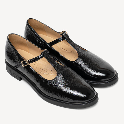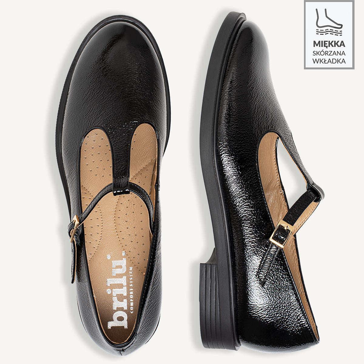 Skórzane lakierowane półbuty damskie z paskiem Samara czarne