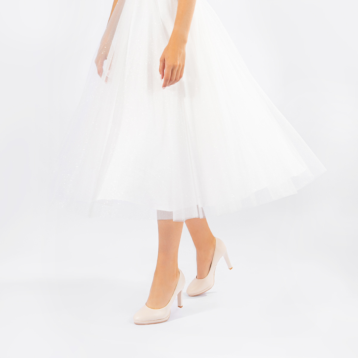 Butami najczęściej wybieranymi do sukni ślubnych są klasyczne szpilki, które są na tyle uniwersalne, że łatwo dopasować je do każdej kreacji. Cielisty odcień butów wykonanych ze skóry ekologicznej doskonale będzie współgrał z suknią ślubną panny młodej. Szpilki na stabilnym obcasie i platformie nie tylko będą się pięknie prezentować, ale też zapewnią Ci najwyższy komfort, który jest przecież tak ważny w tym wyjątkowym dniu. Oprócz tego buty na wysokim obcasie dodadzą Ci kilka centymetrów, optycznie wydłużą nogi i wysmuklą sylwetkę. Szpilki Vivien dostępne są w naszym sklepie również w innych odcieniach i kolorach.